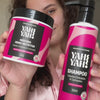 Lave com o Shampoo Cacheados Yah Yah! e aplique a Máscara Hidro-Nutritiva Yah Yah! Enxágue e deixe os fios limpos e úmidos.